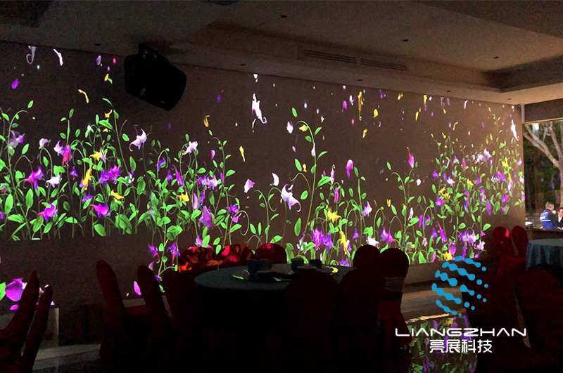 全息宴會廳是將全息投影、T臺互動、舞美道具、婚紗投影、燈光、音響、聲光電等科技元素整合到宴會廳中, 在相互配合的基礎上,通過觸控選擇模式,呈現出沉浸式效果視覺盛宴,原始森林、海底世界、浪漫花海、實現各個場景的瞬間切換置身其中,改變了傳統宴會廳道具固定的形式。