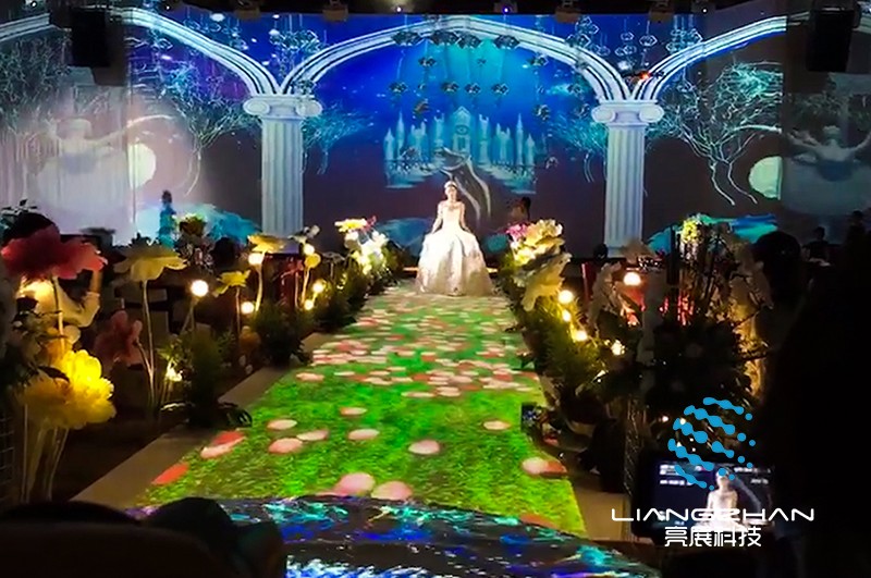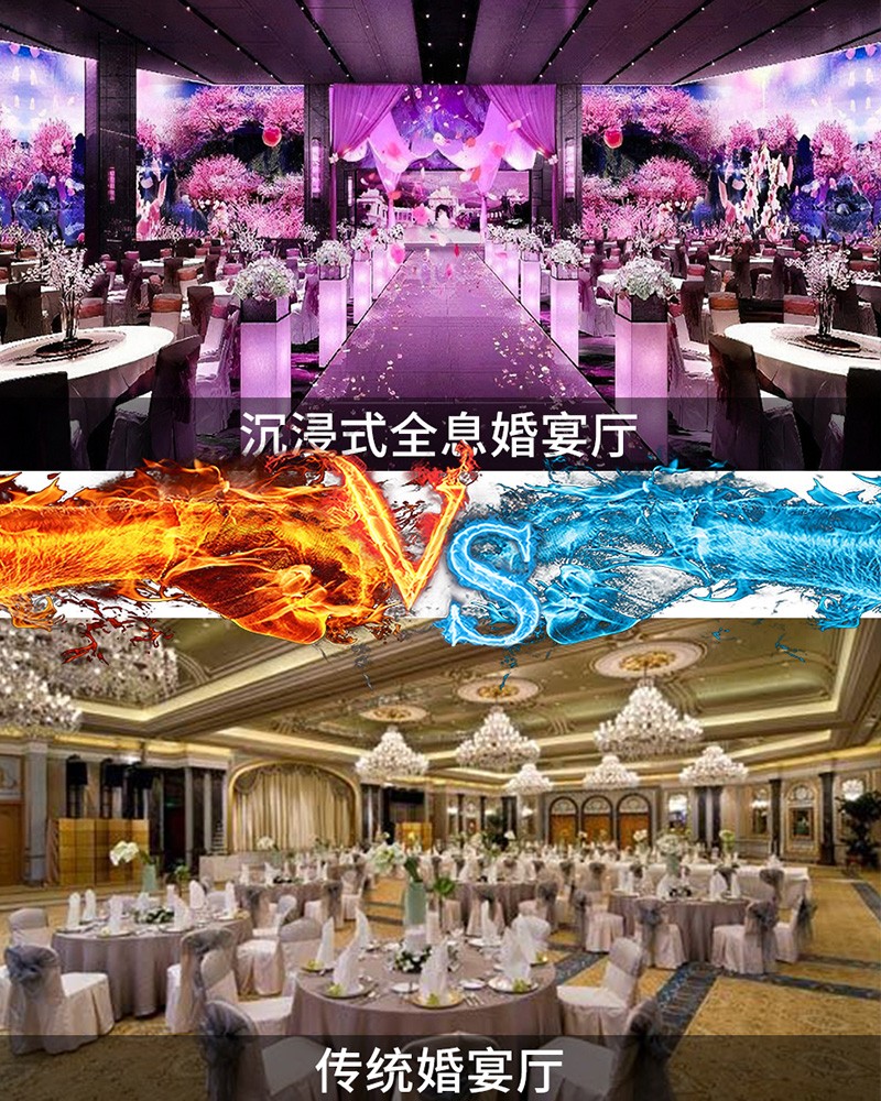 全息宴會廳,簡單來說,就是將全息投影技術、裸眼3D技術、T臺互動、舞臺道具、婚紗投影、照明、聲學、聲學、光電、視覺創意等科技元素融入宴會廳。通過各種元素的巧妙配合,呈現出一場具有5D沉浸效果的視覺盛宴。