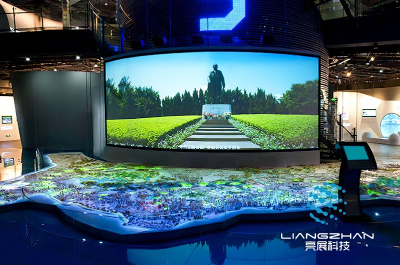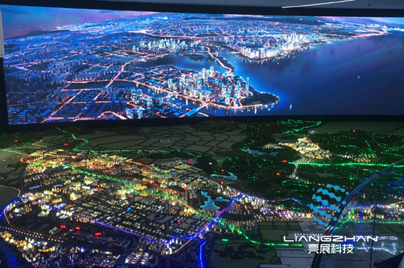 視頻聯動燈光實景沙盤由傳統沙盤和大屏投影或LED結合而成,兩者間可以實現聯動展示,在內容的展示上簡單明了,不落俗套,設計手法上既有對傳統的創新,又有現代高新科技的體現,大模型場面宏大,小模型布局精巧。
